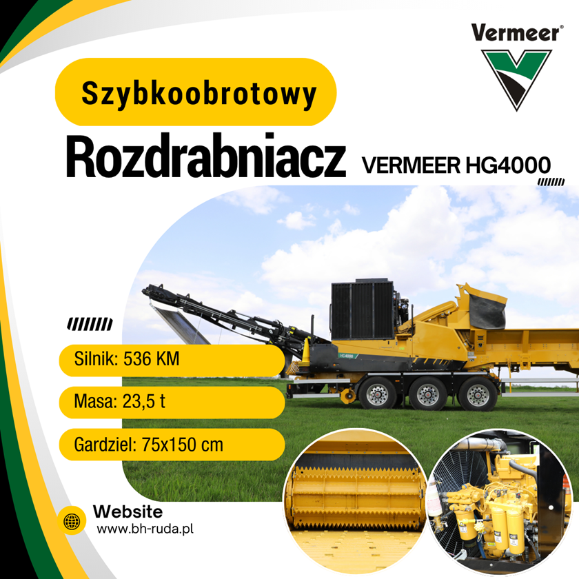 Podczas targów EKO-LAS 2025 Biuro Handlowe RUDA zaprezentuje m.in. rozdrabniacz Vermeer HG4000 – maszynę o mocy 536 KM i wadze 23,5 tony, wyposażoną w nowoczesny bęben DUPLEX II z dwustronnymi elementami roboczymi, co znacząco wydłuża żywotność podzespołów. Duża gardziel (75x150 cm) umożliwia obróbkę materiałów o większych gabarytach, a zestaw sit o powierzchni 2 m² pozwala na bardziej efektywną pracę przy jednoczesnym ograniczeniu zużycia paliwa.